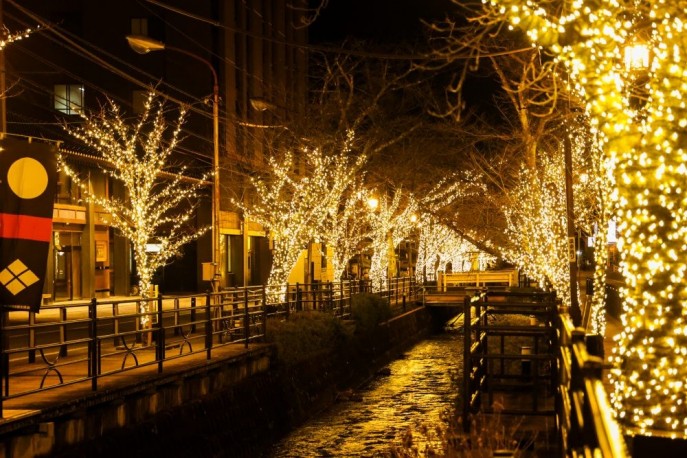 冬の石和温泉街を彩る「さくら温泉通りイルミネーション」が今年も登場。