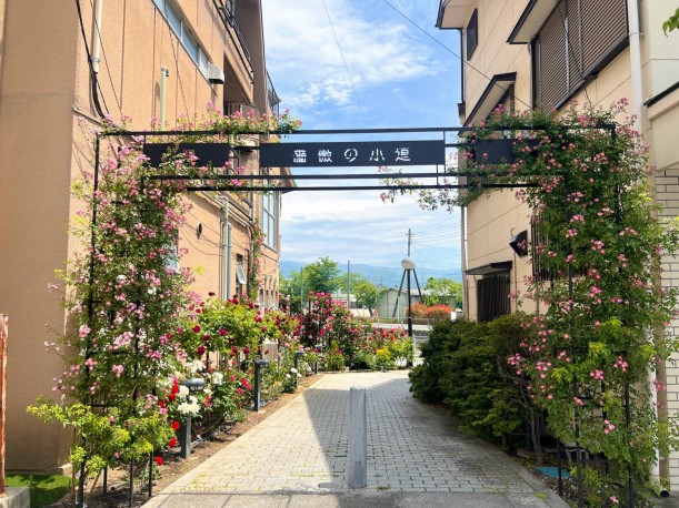 「薔薇の小道」は、山梨県笛吹市・石和温泉にある石和名湯館 糸柳の裏手、平等川沿いに整備された約100メートル続くバラの散策路です。
