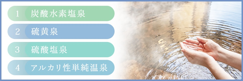 療養に役立つ温泉は「療養泉」と呼びます。療養泉にはそれぞれお湯の性質を表した泉質が名付けられており、美肌効果が期待できる泉質は主に「炭酸水素塩泉」「硫黄泉」「硫酸塩泉」「アルカリ性単純温泉」の4つです。
